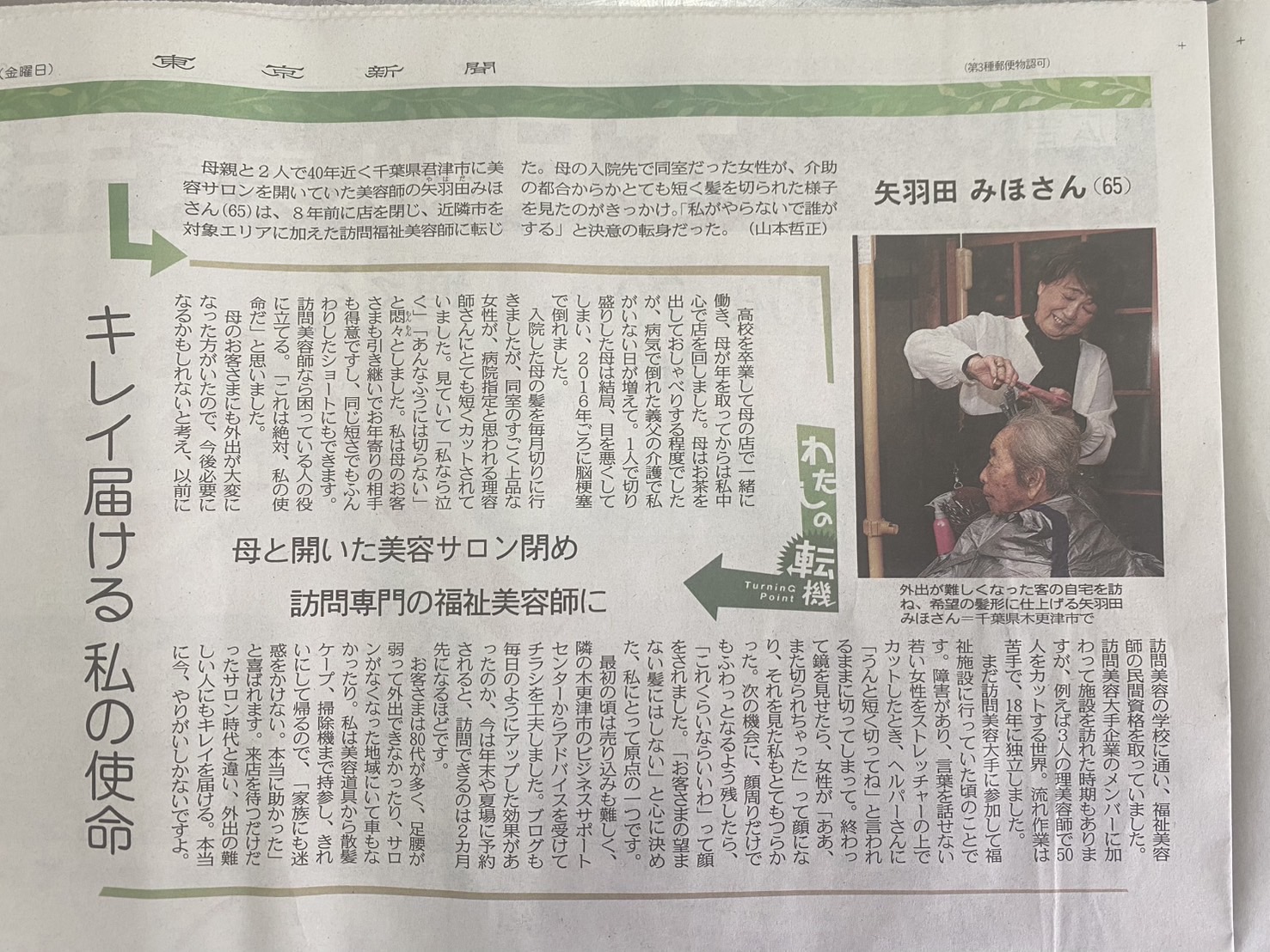 2026年2月20日の東京新聞に載りました! 投稿日 2026年3月26日 著者 矢羽田みほ カテゴリー ブログ 東京新聞に載りました! <わたしの転機>母と開いた美容サロン閉め、訪問専門の福祉美容師に 矢羽田みほさん(65) キレイ届ける 私の使命